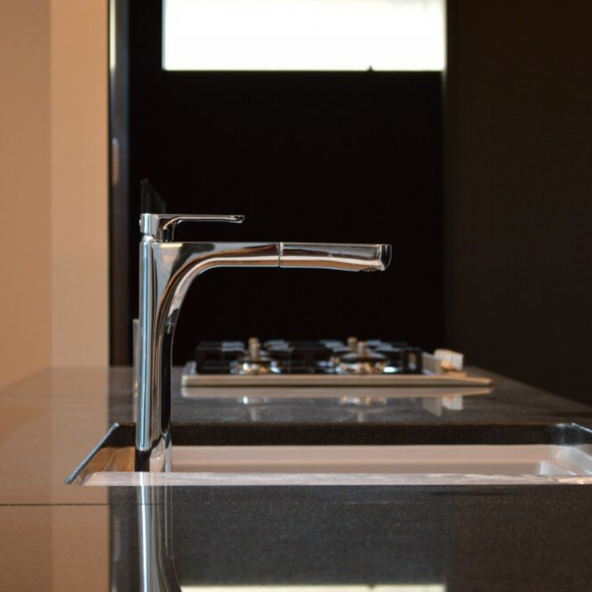 蛇口ヘッドがホースで延びるタイプのキッチン水栓。